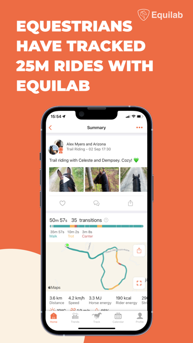 Start tracking your rides with the world’s leading app for equestrians. Equilab lets you track the distance, speed, gaits, and turns of your sessions — all using your smartphone (or Apple Watch). Then, review your data over time to see how you and your horse have progressed! It also keeps you safe while riding alone by letting family and friends track your live location, so that they always know where you are. Download the app to join the world’s largest equestrian community, with over 1 million users! With Equilab, you can effortless track each session simply by taking your iPhone and/or Apple Watch with you when you ride. Our advanced gait analysis technology provides insights so that you and your horse(s) can continue to grow. (Equilab's Premium subscription allows users to track rides with just their standalone Apple Watch.) For those who ride alone and/or out in nature, Equilab helps you discover new trails and stay safe. By adding Safety Contacts in the app, you can ensure that your loved ones can always see where you are. They will also receive an alert if you stop moving for 5+ minutes. You can use Equilab to: 1. Track every ride — use your phone or compatible Apple Watch when you ride to analyze your gait, distance, time, and more. 2. Stay safe — enable family and friends to track your location while riding so that they always know where you are. (Premium feature) 3. Get motivated — ride more to complete Challenges and earn achievements that help you and your friends grow as equestrians. 4. Celebrate progress — show off your growth as an equestrian and celebrate your friends as they grow, too. 5. Connect with other equestrians — chat with riders in your community or across the world 6. Organize your life — plan your routines and coordinate trainers, vets, or co-riders with Equilab's shared calendars and groups. 7. Monitor your health — Equilab integrates with Apple’s HealthKit so that you can understand how your training impacts your fitness. Equilab also helps simplify your equestrian life. Easily join groups and connect with friends, trainers, vets, farriers, and more to share rides, schedules, and other important information. As the largest community of equestrians in the world, Equilab makes coordinating with others easy. Our app is used by equestrians of all levels, from Olympic riders to weekend hobby riders. They ride and train in over 50 countries across 6 continents. We empower all riders - so no matter your level, Equilab can help you grow as an equestrian. Equilab Premium Subscription Our app offers a recurring subscription product that provides full access to safety tracking, advanced training details, weather history for your rides, a customized equestrian calendar, and more powerful features! You can purchase an Equilab Premium subscription for 1 month ($12.99), 6 months ($59.99), or 1 year ($99.99) (prices for users in the U.S.). A one-week free trial is available for all first-time users. When you subscribe to Equilab Premium, you’ll automatically be charged via your Apple account when you confirm the purchase. Your subscription will automatically renew unless canceled at least 24 hours before the end of the current billing period. Your account will be charged for renewal within 24 hours prior to the end of the current period. The user may manage subscriptions, and auto-renew may be turned off after purchase by going to the ‘Manage Subscription’ page of your Apple account (accessible your iPhone or iPad’s Settings). Any unused portion of a free trial period (if offered) will be forfeited when the user purchases a subscription. Subscriptions will renew at the same cost, and Equilab will notify subscribers ahead of any pricing changes. If you decide to cancel, you will retain access to Equilab’s Premium features until the end of the final billing period. Terms and Conditions: https://equilab.horse/termsandconditions Privacy Policy: https://equilab.horse/privacypolicy