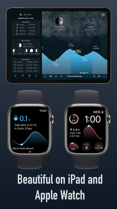 Tide Alert is the #1 app for tide predictions, tidal currents, and lunar phases, all in one beautiful interface. Powered by NOAA tide forecasts, it delivers accurate high tide and low tide times, current speeds, slack tide windows, swell data, water temperature, and wind conditions for thousands of stations along the US coastline. Set custom alerts for high tide, low tide, or any tide level you choose and never miss a window again. With full offline support, your tide data is always available, even without cell service. What's New: Tidal Currents & Slack Tides • View real-time tidal current speed overlayed on the tide chart. • See slack tide periods with estimated begin and end times. • Current data sourced from NOAA current prediction stations. Compare Tide Charts • Compare multiple stations side by side. • Add stations to compare directly from the map. Monthly High & Low • Redesigned monthly view with visual tide range bars. • See the month's lowest, highest, and average tidal range at a glance. Apple Watch • New ocean conditions view with wind, swell height, water temperature, and current speed. • Tap the wave icon on the main screen to check conditions instantly. Wind, Swell & Water Temperature • Hourly wind speed, gust, and direction forecasts. • Swell chart with height, period, and direction. • Water temperature from NOAA and Open-Meteo. Who is Tide Alert for? Anyone who needs to know the tides. Fishermen timing their catch. Surfers checking swell and tides together. Kayakers and paddleboarders planning safe launches. Boaters and sailors navigating harbors. Crabbers and clammers working low tides. Beach photographers chasing golden hour at low tide. Dog walkers, birdwatchers, and tide pool explorers. Divers planning slack water entries. Key Features: • Tide predictions for thousands of NOAA stations across the US. • Tidal current speed and slack tide annotations on the chart. • Custom tide alerts — get notified for high tide, low tide, or any level. • Full offline access to tide data and charts for favorite stations. • Interactive map with station discovery and quick actions. • Compare tide charts across multiple stations. • Monthly high & low tide overview with daily range bars. • Wind, swell, and water temperature conditions. • Sunrise, sunset, moonrise, and moonset on the chart. • Moon phase calendar. • Apple Watch app with tide chart, conditions, and complications. • Home Screen, Lock Screen, and StandBy widgets. • iOS Shortcuts and Siri voice commands. • Customizable chart symbols and reference levels. • Supports all US time zones and daylight saving time. Tide Alert is free to try with all features available during the trial period. After the trial, a subscription is required to continue. Terms of Use: https://www.apple.com/legal/internet-services/itunes/dev/stdeula/ DISCLAIMER — See https://tidealert.app/disclaimer.html Use Tide Alert at your own risk. Tide data does not account for the effects of wind, storms, rain, freshwater runoff, or floods. The tide graph uses predicted high and low tide events with approximated segments between them. Do NOT use Tide Alert for NAVIGATION or any purpose that may result in personal injury or property damage. Tide Alert is not liable for any loss, injuries, or damage caused by its use. Tide Alert is not associated with NOAA.