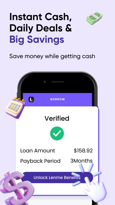 ACCESS INSTANT $200 CASH ADVANCE - NO MATTER YOUR CREDIT SCORE! Welcome to Lenme, the one-stop app where your money needs meet real solutions—fast, fair, and flexible. Whether you're facing an unexpected bill or just need a boost until payday, Lenme makes Personal Loans and Instant Cash Advances simple and accessible for everyone. UNLOCK FAST CASH, TOTAL CONTROL, AND ZERO STRESS All-Inclusive Loan Options: Whether you need $50 or $5,000, Lenme has the Loan designed for your needs—groceries, bills, emergencies, you name it. No Hidden Fees: Enjoy full transparency. Your subscription gives you access to thousands of lenders ready to fund you—with zero tips, extra fees, or surprise charges. Balance Guard = Full Protection: Tired of overdraft fees? Just set a balance limit, and Lenme will auto-secure a Cash Advance to protect your account. Instant Offers: Post your request and get real funding offers from our trusted lenders—often in just minutes. Loans on Your Terms: You choose the amount, repayment period, and the offer that fits your lifestyle. No pressure, only options. Daily Deals, Big Savings: Enjoy access to money-saving tools like Credit Score boosters, Insurance plans, and Side Hustle programs—all in our Marketplace. Lenme isn’t just for borrowers. It’s also the perfect gateway to Passive Income and Financial Freedom. LENDERS – MAKE MONEY WHILE YOU SLEEP Access 2.5M+ Borrowers: Gain access to millions of verified loan seekers. You’re in Charge: Set your own interest rates, send offers, and lend on your terms. Automate Everything: From lending to withdrawals, Lenme’s automation tools handle it all—effortlessly growing your earnings. OWN CRYPTO? WE HAVE A SPECIAL LOAN FOR YOU! By connecting your crypto wallet, you unlock exclusive access to Personal Loans up to $10,000—a new kind of borrowing backed by your assets. Download Lenme now and experience the smarter, faster way to access Cash Advances or Personal Loans you deserve—no matter where life takes you. Lenme is a lending platform that connects people looking to borrow money with financial institutions, lending businesses, and individual investors looking to invest in the loan market. Users remain completely anonymous throughout the entire borrowing/lending process. For transparency and to encourage a fair and competitive market, the “feed” tab within the app allows users to see which loans are being funded and at what interest rate. Lenme offers monthly and annual subscription plans available via In-App Purchases. Subscriptions automatically renew unless auto-renew is turned off at least 24 hours before the end of the current period. You can manage or cancel your subscription at any time by going to your Account Settings on the App Store after purchase. Crypto-backed loans, our new product allows investors to fund cash loans backed by cryptocurrency owned by the borrower. Cryptocurrencies are used as collateral and may be liquidated in case of default or sudden price drop of the held currency. Since our app is not directly involved in the lending decision, we cannot guarantee the interest rate borrowers will be offered. All borrowers have the option to request a loan on our platform for up to a 12-month repayment period, paid in installments. Lenders can offer loans for a minimum of 3% APR based on the credit score and their own criteria. The lending decision is based on multiple factors viewable on our app, including credit, income, and cash flow analysis. A representative example of the total cost of the loan, including all applicable fees: If you borrow $1,000 over a term of 1 year with an APR of 12% and an origination fee of 1%, you will pay $89.75 per month. The total amount payable will be $1,076.96, with a total interest and fees of $76.96. For more information, see our Terms of Use and Privacy Policy: https://lenme.com/privacy-policy/ https://lenme.com/term-of-use/