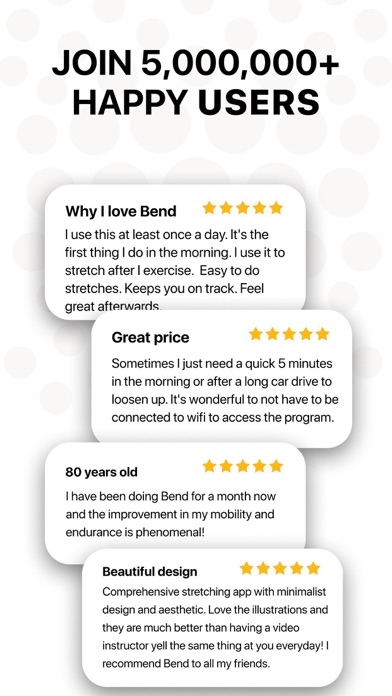 Bend® is the simple, affordable way to make stretching a part of your daily routine. Our quick & convenient stretching routines help you improve your flexibility and maintain your natural range of motion as you get older. We offer hundreds of stretches and yoga poses along with dozens of easy-to-follow stretching routines designed for all ages and experience levels. It's never too early to start stretching everyday! STRETCHING IS IMPORTANT A simple, daily stretching routine can have a huge impact on your quality of life. Every time you stretch, you invest in your long-term health and longevity. Stretching benefits include: ⊕ Increase flexibility & mobility in your muscles and joints ⊕ Prevent and relieve pain in your lower back, neck, hips, shoulders and more ⊕ Reduce the risk of injury during outdoor activities and sports ⊕ Improve sleep quality and energy throughout the day ⊕ Improve posture and strengthen your core ⊕ Reduce stress & anxiety ⊕ Improve athletic performance ⊕ Improve circulation and blood flow ⊕ Accelerate muscle recovery ⊕ Improve balance & coordination ⊕ And more! YOUR BODY'S FAVORITE APP™ Bend offers dozens of daily stretching & mobility routines for every occasion. ⊕ “Wake Up” Designed to maintain your body’s natural mobility and range of motion. Simple, quick, convenient, and effective, you can do it anytime, anywhere, everyday. ⊕ “Posture Reset” Specifically designed to improve your posture with seated stretches that can correct habitual posture problems by increasing flexibility in the shoulders, back, and neck. ⊕ “Full Body” Focused on improving overall flexibility, with more than 20 stretching exercises and poses that target key muscles and joints throughout your entire body. ⊕ “Sleep” Gentle, long-hold stretches designed to help you unwind and de-stress after a long day at work through better quality of sleep, which is made possible by relieving muscle tension and relaxing the body. ⊕ “Expert” Advance group of stretching exercises and yoga poses that cover all major muscle groups and extremities. Flexibility and range of motion can be improved significantly with their more complex movements. ⊕ "Hips" Open and unlock tight hips with deep, focused stretches designed to improve hip flexibility and undo hours of inactivity from sitting at a desk, in a car, or on the couch. ⊕ "Hamstrings" Improve hamstring flexibility with subtle stretches designed to reduce hamstring tightness and relieve pressure on the knees, pelvis, and lower back. ⊕ "Lower Back" Reduce and prevent lower back pain with gentle stretches designed to increase flexibility in the lower back, pelvis, and hip flexors. ⊕ "Isometric" isometric exercise routines that build muscle, strength, balance, and range of motion in targeted areas through static muscle contraction. ⊕ And more! CREATE YOUR OWN Create your own custom stretching routine suited to your specific needs. Choose from hundreds of stretches, yoga poses, and isometric exercises in our library. EASY-TO-USE Bend makes stretching simple. We use custom illustrations and a timer to guide you through each routine. Every stretch has detailed instructions, information about its benefits, and specific things to be cautious about! STREAKS & ANALYTICS Our dashboard displays your streaks and analytics to track your progress and you can set reminders to help motivate you to stretch every day. Check your Bendometer as a quick way to see how consistent you’ve been stretching over the last few weeks. We recommend trying to keep your Bendometer score above 90%! APPLE HEALTH Bend integrates with the Health app, giving users the option to sync their health information and activity with Apple Health. FEEDBACK & SUPPORT If you have any questions, feedback, or suggestions, feel free to contact us at hello@bend.com! LEGAL Terms of Use: https://bend.com/terms Privacy Policy: https://bend.com/privacy