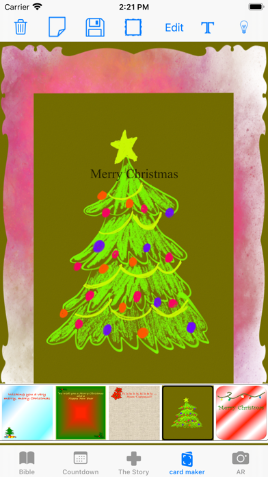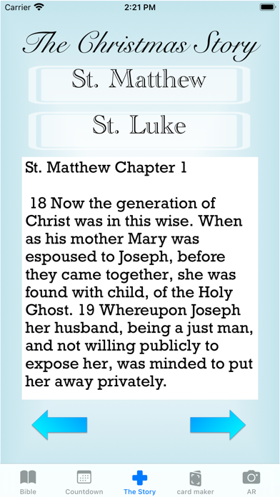 Celebrate Christmas: - Read about the birth of Jesus Christ in Scripture - Countdown to Christmas - Bible (Douay Rheims Version) included and accessible offline - Customize background, frame, and text to create a Christmas Card - Display selected verses in AR Jesus is the reason for the season. Merry Christmas.