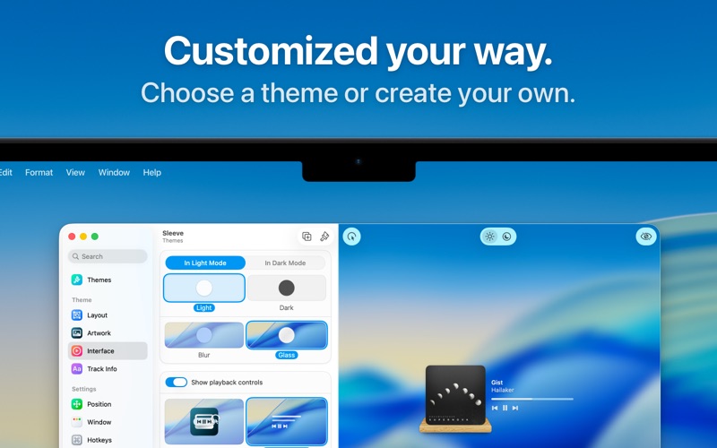 Introducing Sleeve - the ultimate "Now Playing" music accessory for your desktop. Sleeve integrates with your favorite music apps: Apple Music, Spotify, and Doppler, to display your currently playing track and let you control playback from anywhere. Sleeve gives you total control over how artwork, track info, and playback controls are displayed, letting you customize the theme to fit your setup. - Theme support, with 7 new built-in themes, gives you the ability to create multiple themes, switch between them and share them with friends. - An entirely redesigned user interface supports hundreds of possible configurations, a richer preview mode, and instant search for every single preference. - Playback controls including Play/Pause, Prev/Next, Shuffle, Repeat, Love, and Volume. - Last.fm integration, to scrobble tracks from whatever you're listening to, with advanced behavior options. - Global keyboard shortcuts let you control your music with your fingertips, with a beautiful new HUD for seamless feedback. - Save any track from Spotify to your 'Liked Songs' playlist with a single click or the press of a hotkey with the Spotify Web API integration.