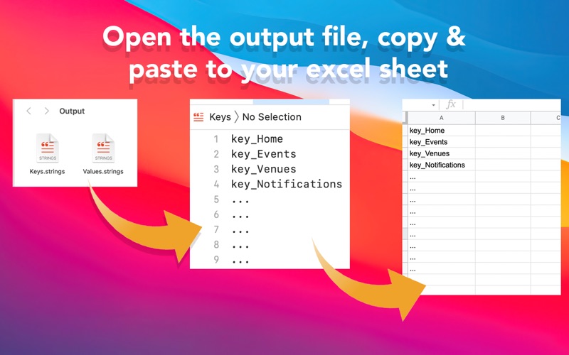 Are you struggling to split the keys and values from '.strings' file and copy them to your excel sheet? Localization Splitter can help you to separate the keys/values for you. Just drag and drop your strings file and export the whole keys and values as a single file.