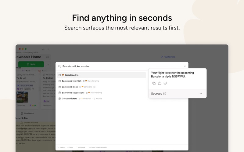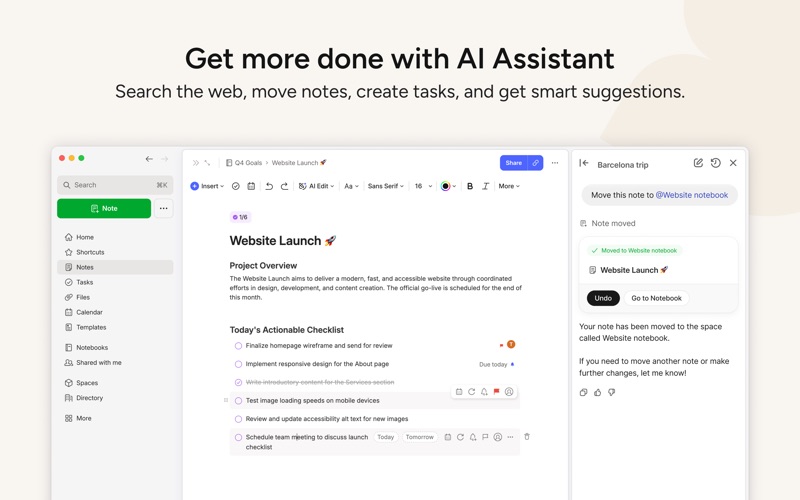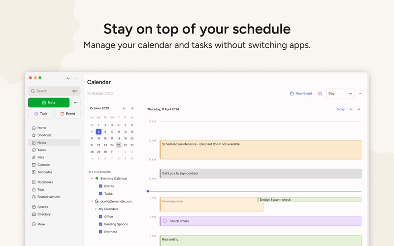 Capture ideas when inspiration strikes. Bring your notes, to-dos, and schedule together to tame life’s distractions and accomplish more—at work, at home, and everywhere in between. Evernote syncs to all your devices, so you can stay productive on the go. Tackle your to-do list with Tasks, connect your Google Calendar to stay on top of your schedule, and see your most relevant information quickly with a customizable Home dashboard. --- “Use Evernote as the place you put everything… Don’t ask yourself which device it’s on—it’s in Evernote” – The New York Times “When it comes to taking all manner of notes and getting work done, Evernote is an indispensable tool.” – PC Mag --- CAPTURE IDEAS • Write, collect, and capture ideas as searchable notes, notebooks, and to-do lists. • Clip interesting articles and web pages to read or use later. • Add different types of content to your notes: text, docs, PDFs, sketches, photos, audio, web clippings, and more. • Use your camera to scan and organize paper documents, business cards, whiteboards, and handwritten notes. GET ORGANIZED • Manage your to-do list with Tasks—set due dates and reminders, so you never miss a deadline. • Connect Evernote and Google Calendar to bring your schedule and your notes together. • See your most relevant information instantly on the Home dashboard. • Create separate notebooks to organize receipts, bills, and invoices. • Find anything fast—Evernote's powerful search can even find text in images and handwritten notes. ACCESS ANYWHERE • Sync your notes and notebooks automatically across any computer, phone, or tablet. • Start work on one device and continue on another without missing a beat. EVERNOTE IN EVERYDAY LIFE • Keep a journal to keep your thoughts organized. • Go paperless by scanning receipts and important documents. EVERNOTE IN BUSINESS • Keep everyone up to date by capturing meeting notes and sharing notebooks with your team. • Bring people, projects, and ideas together with shared Spaces. EVERNOTE IN EDUCATION • Keep track of lecture notes, exams, and assignments so you don’t miss important details. • Create notebooks for each class and keep everything organized. --- Privacy Policy: https://evernote.com/legal/privacy.php Terms of Service: https://evernote.com/legal/tos.php Commercial terms: https://evernote.com/legal/commercial-terms