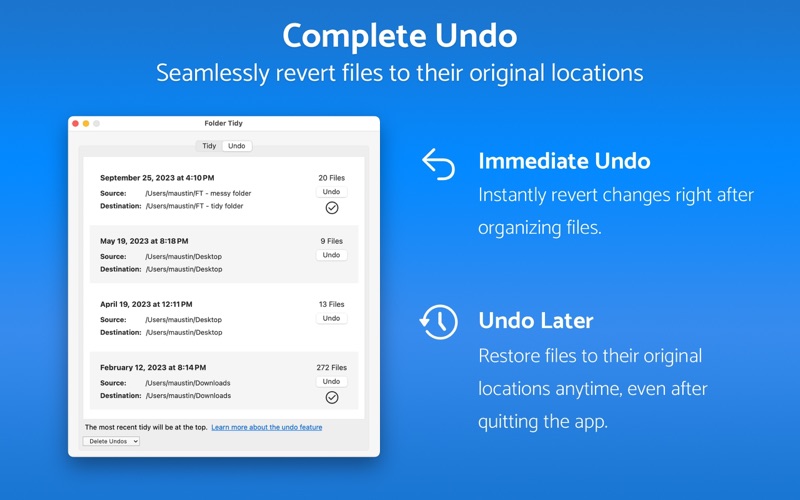 Continuously Featured on the Mac App Store for Over Six Years Transform disorganized folders into neatly organized subfolders effortlessly. Choose from the 22 built-in rules or craft your own to sort files with precision. Leveraging multi-core processing, Folder Tidy swiftly manages even gigabytes of files. ONE-CLICK ORGANIZATION A single click swiftly tidies up cluttered files, relocating them into categorized subfolders—be it Pictures, Music, Spreadsheets, or Source Code. Custom rules offer advanced sorting, such as moving pictures older than 2025 to an "Old Pictures" folder, or sending Word documents tagged as "Work" into "My Office Work Files." REVERSIBLE ACTIONS Not quite satisfied with the outcome? The Undo button restores all files to their original locations. A novel historical undo feature allows for reversing any tidying operation even at a later date. KEY FEATURES • Sort files into subfolders based on predefined or custom rules. • Multiple built-in rules (now 22 and counting) for various needs. • Specify file types for clean-up and set items to ignore. • Choose custom destinations for the organized files. • Options to disregard aliases, folders, and labeled items. • Instant or historical undo capabilities. HIGHLY RATED AND RECOGNIZED Internationally acclaimed with hundreds of five-star ratings. Featured in the Mac App Store, Lifehacker, Addictive Tips, Softpedia, Mac360, MakeUseOf.com, and Macworld.