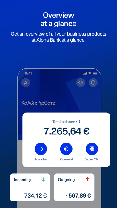 Gain control over your business finances through your mobile. With the Alpha bank business mobile app, you carry out fast and secure transactions for your business any time you want and manage your products on the go. Download the app and log in using your business digital banking credentials. If you don't have digital banking credentials for your business, sign up in a few steps through alpha.gr: e-Banking > Business > Registration of new subscriber, as long as you own a sole proprietorship or a business with 1 legal representative. Otherwise, book an appointment to visit a branch near you. CONTROL AND UPDATES • Get a complete overview of your business accounts. • Check your personal and business contact details. SECURE TRANSACTIONS • Log into the app securely with biometrics or a PIN. • Approve your transactions with a 4-digit PIN and biometrics. SHARE YOUR EXPERIENCE WITH US Our goal is to provide you with the best possible services. Taking into account your proposals and remarks, we update our app with new functionalities. To contact us, send us an email at ebankingsupport@alpha.gr.