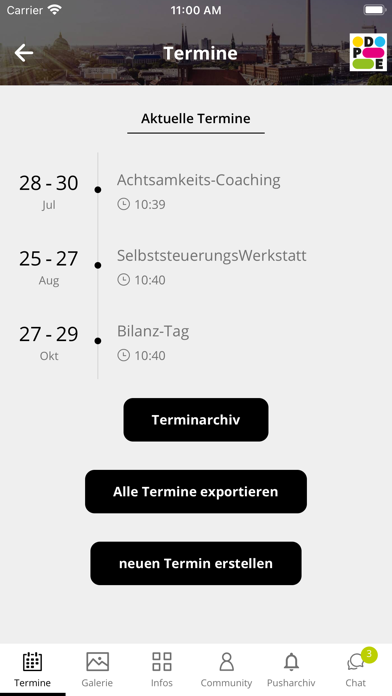 Die DPE App bietet den Unternehmen und ihren Teilnehmenden den Zugriff auf alle Inhalte im Rahmen der von uns angebotenen Potentialentwicklungsprogramme: Termine, Bilder, Unterlagen. Darüber hinaus können alle APP-User untereinander chatten und eigene Peer-Groups anlegen.