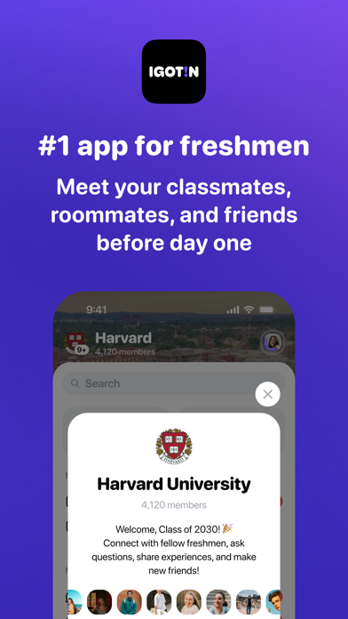 Create, join, and grow real college communities — all centered around your school. IGOTIN is a campus-based social platform built for real college life. From the moment you get accepted, you can connect with future classmates, join school-specific group chats, and start building your college network early. Got into college? Meet the Class of 2030, find a roommate, make friends, and join group chats for every school you’ve been accepted to. Verify with your school email to unlock exclusive campus communities and ask real students questions about housing, classes, and campus life. More than just chat. On IGOTIN, students also discover scholarships, internships, and career-building part-time jobs — all shared and recommended within their own school communities. Whether you’re an incoming freshman or planning your next career step — this is where your campus life comes together. Terms of Use: https://terms.igotin.app/service Privacy Policy: https://terms.igotin.app/privacy Apple EULA: https://www.apple.com/legal/internet-services/itunes/dev/stdeula/