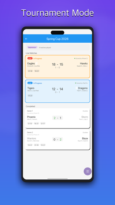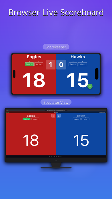 One scoreboard. Every sport. Every screen. Score Syncer is the universal live scoreboard for clubs, tournaments, and casual games. Keep score on one phone — every other screen updates in under 1 second. ▸ Universal Scoreboard Supports badminton, table tennis, tennis, pickleball, basketball, volleyball, soccer, and padel — with the correct rules built in for each sport. One app for your entire club. ▸ Live Score Broadcast Share a single link. Spectators, coaches, and parents watch live scores from any browser — no app install needed. From courtside to anywhere in the world. ▸ Tournament Mode Generate brackets instantly. Manage every match from one screen. Invite players with a QR code. Works for round-robins and elimination tournaments. ▸ Instant Multi-Device Sync WebSocket push (under 1s), HTTP fallback, Bluetooth offline. Triple-redundant sync — the score is always right, even without internet. ▸ Apple Watch Control Control scores from your wrist. Start, stop, and record points without touching your phone. ▸ TV Scoreboard (AirPlay / HDMI) Cast the live scoreboard to any TV or big screen via AirPlay or HDMI. Perfect for gym display boards and tournament venues. ▸ Do Not Disturb Mode One tap enables Do Not Disturb so calls and notifications never interrupt a match. ▸ Match History & Export Every score recorded, point by point. Review full match history and share as a text file. ▸ Net View (Doubles) Stand at the net, see both teams on one screen. Large score display with serve indicators — designed for umpires and referees. ▸ Works Offline Bluetooth P2P scoring when there's no Wi-Fi. Score anywhere. Free download. Score your first match in 10 seconds.