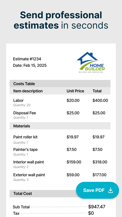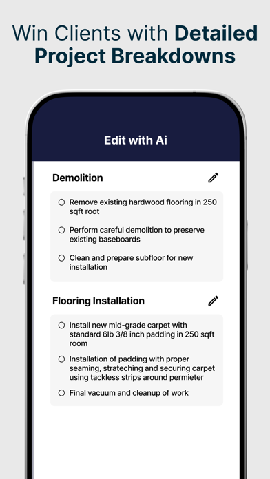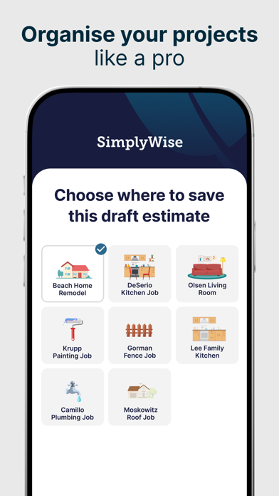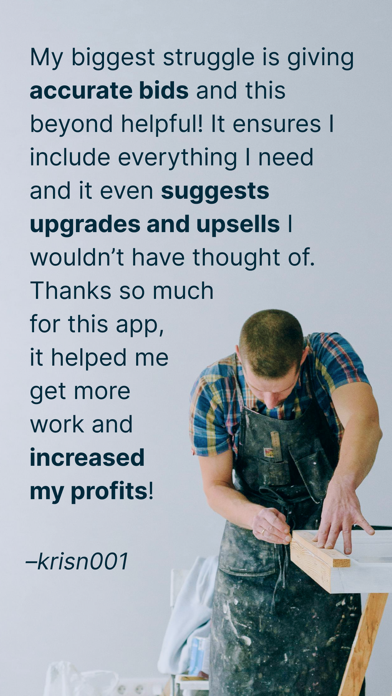 SimplyWise Cost Estimator is a mobile construction estimating app that turns job site photos into detailed, professional estimates in seconds. Powered by AI, it breaks down every project into material and labor costs, generates polished bids you can send on the spot, and even suggests upsells to increase your revenue. Trusted by 10,000+ contractors with a 4.8-star rating. Stop guessing on project costs. Whether you need a construction estimate for a kitchen renovation, a roofing job, or a full home remodel, SimplyWise is the fastest way to create accurate contractor estimates and send them to clients right from the job site. KEY FEATURES • AI-Powered Estimates — Snap a photo and get a detailed cost breakdown with materials and labor in seconds • Before & After Visualization — Show clients exactly what their renovation will look like with AI-generated renderings • 3D Room Scanning — Use your phone's LIDAR to capture accurate room measurements • Professional Bid Creation — Generate and send polished, branded estimates as PDF • Smart Upsell Suggestions — AI recommends upgrades and add-ons to increase your job value and profit margins • Built-In Markups — Automatically apply your profit margins and overhead to every estimate • Invoicing — Bill clients directly from the app once the job is done • Work Order Management — Track every project from estimate to completion • Project Organization — Keep estimates organized by room, job type, or client in custom folders WHO IS SIMPLYWISE COST ESTIMATOR BEST FOR? SimplyWise is the best construction estimating app for professionals who need fast, accurate estimates without complex enterprise software: • General Contractors managing renovation and building projects • Roofers and Siding Contractors pricing jobs on-site • Remodeling Contractors estimating kitchen, bath, and home renovation work • Painters and Flooring Specialists creating material and labor breakdowns • Plumbers quoting residential and commercial jobs • Small Construction Business Owners who want professional bids without the overhead WHY CONTRACTORS CHOOSE SIMPLYWISE Unlike spreadsheets or desktop construction estimating software that takes weeks to learn, SimplyWise lets you create professional estimates in minutes right from your phone: • Photo to Estimate: No manual data entry. Point, shoot, get your cost estimate • Win More Jobs: Before/after visualizations help clients say yes faster • Increase Revenue: AI-powered upsell suggestions find add-on opportunities you might miss • Work From Anywhere: Create and send estimates from the job site, no office required • Save Hours Every Week: Automate the estimating process so you can focus on the work that pays WHAT YOU CAN ESTIMATE SimplyWise handles cost estimation for all types of construction and renovation projects: • Kitchen and bathroom renovations • Roofing and siding • Interior and exterior painting • Flooring installation and repair • Plumbing work • Fencing and decking • General home remodeling and renovation • New construction and building projects • Demolition and cleanup WHAT CONTRACTORS ARE SAYING "SimplyWise has transformed the way I manage my construction projects. It's even helped me improve my profit margins by automating markups. I love how easy it is to generate professional bids — honestly, I couldn't run my business without it." — Jennifer M., General Contractor "As a small business owner, SimplyWise has been a lifesaver! I can instantly generate estimates and bids on-site and send them to clients in minutes. It's made managing multiple projects so much easier and saved me countless hours." — Alex R., Roofer To learn more, visit our Terms of Service at https://www.simplywise.com/terms.