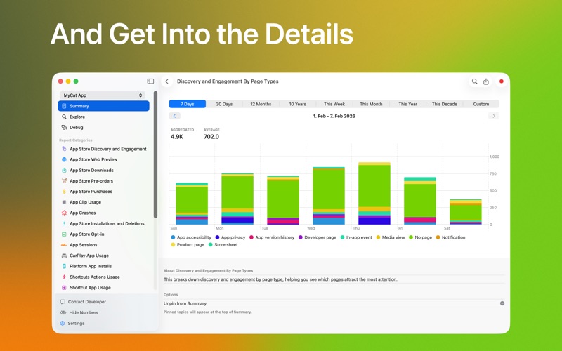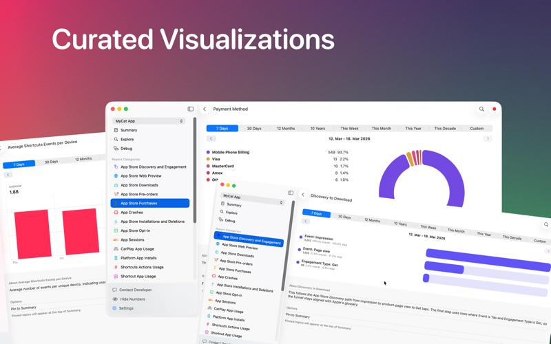 Access hidden App Store Connect insights about how your users interact with your app, both inside and outside. Build custom dashboards to track the metrics that matter most. Understand your user base better than ever before. No third-party SDK required. HIDDEN DATA Access App Store Connect analytics data that was never available before. Learn if your users engage with your privacy labels, reviews, and developer page. Analyze what share of users use the framework features you implemented and how they interact with them. CUSTOM REPORTS Build custom reports for your individual needs. Select from a wide variety of available reports and filter, categorize, and aggregate the data. Add visual overlays like prior period comparisons and save your custom presets for easy access to the data that matters to you. NO SETUP REQUIRED All data is automatically collected through App Store Connect. No third-party package or code changes needed. App Store Connect automatically collects aggregated data about user interactions outside and inside the app. Outside the app covers App Store pages and on device interactions like Shortcuts, widgets, and Live Activities. Inside the app, data like session metrics and framework usage statistics is available. Some data may not be available for apps with too few daily active users to protect individual privacy. For feedback or help, contact support@connectwizard.app or use the built-in form. EULA: https://www.apple.com/legal/internet-services/itunes/dev/stdeula/