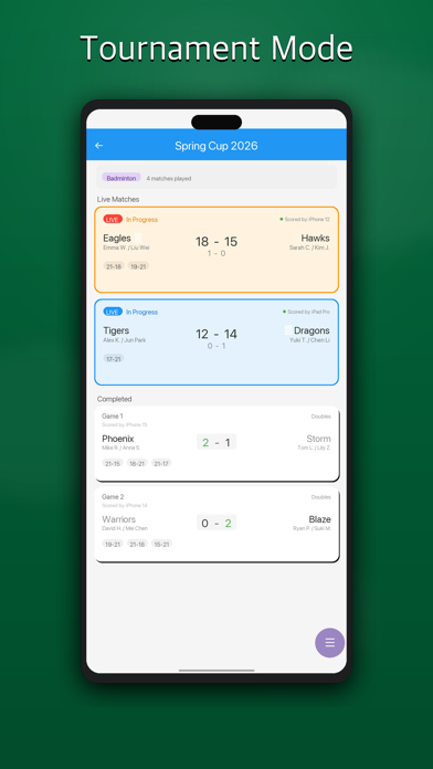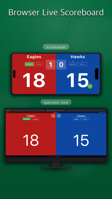 Still using pen and paper to track your match results? Your scores — live, on every screen. ▸ Accurate Scoring • Real-Time Sync — All devices update in under 1 second. Triple-redundant sync. The score is always right. • Score History — Every match fully recorded. Review results and track your progress anytime. • 21-Point Rules Built In — Change of ends, interval, game point — all automatic. Just play. ▸ Live Broadcast, Anywhere • Browser Live Scoreboard — Share one link. Parents, coaches, and fans follow live from any browser. No app needed. • Tournament Mode — Auto-generate brackets, invite players by QR code, track every court simultaneously. • Full Overview — Every match in your tournament, live on one screen. ▸ More Ways to Score • TV Scoreboard — Cast the live score to any TV via AirPlay or HDMI. Perfect for gym courts and club venues. • Do Not Disturb — Silence calls and notifications automatically during your match. • Match History & Export — Full point-by-point record for every match. Review and share as a text file. • Net View — Umpire perspective for doubles. See both pairs from the net position. ▸ Built For Every Player → Club nights and weekly leagues → Regional and inter-club tournaments → Coaches running training matches → Any game that needs a scoreboard Free download. Your match is live now. Play multiple sports? Score Syncer covers badminton, table tennis, tennis, pickleball, basketball, volleyball, soccer, and more. Search "Score Syncer" on the App Store.