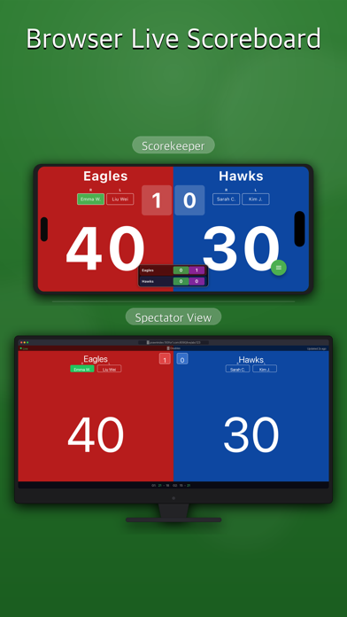 40-30. Second serve. Tiebreak in the third set. How many games was that? TennisKeeper handles the full complexity of tennis scoring so you can focus on the match. Points, games, sets, tiebreaks, advantage — all automatic, synced live across every device courtside. WHY TENNIS PLAYERS SWITCH: • Complete Tennis Scoring — 0, 15, 30, 40, Deuce, Advantage. Games, sets, and tiebreaks update automatically. No mental math during changeovers. • Real-Time Sync — Your doubles partner, opponents, and spectators all see the same score in under 1 second. Multiple sync methods with automatic fallback. • Tournament Mode — Run club ladders, round-robins, or elimination brackets. Generate draws, track every court live, invite players via QR code. • Browser Live Scoreboard — Share a link. Friends and fans watch set-by-set scores update live from any device — no app needed. • Tiebreak Support — Standard 7-point tiebreak and 10-point match tiebreak (super tiebreak). Serve rotation handled automatically. • Flexible Format — Best of 1, 3, or 5 sets. No-ad scoring. Short sets. Pro set. Your club's rules, built in. • Set Results Display — Clean visual history of completed sets at a glance. • Match History — Full point-by-point record of every game. Export and share as a text file. • TV Scoreboard — Mirror the scoreboard to any TV via AirPlay or HDMI. Spectators never miss a point. • Do Not Disturb — Automatically silences calls and notifications during your match. PERFECT FOR: → Club matches and interclub leagues → Social doubles on weekend mornings → Umpires at local and regional tournaments → Coaches tracking match play and development Free to download. Love-all, ready, play. Play multiple sports? Score Syncer covers badminton, table tennis, tennis, pickleball, basketball, volleyball, soccer, and more — one app for your whole club. Search "Score Syncer" on the App Store. FEATURES: • Complete Tennis Scoring — Points (0, 15, 30, 40, Ad), games, sets, and tiebreaks • Singles & Doubles — Full support with serve tracking • Real-Time Sync — Sync scores across multiple devices via WebSocket, HTTP, or Bluetooth • Tournament Mode — Create tournaments, generate brackets, track all matches live • Browser Live Scoreboard — Share a link for spectators to watch scores in real-time • Tiebreak Rules — Standard 7-point tiebreak and match tiebreak (10-point) support • Customizable — Best of 1/3/5 sets, no-ad scoring, short sets, and more • Set Results Display — Clear visual display of completed set scores • Match History — Full point-by-point record, exportable as text file • TV Scoreboard — AirPlay / HDMI display for big screens • Do Not Disturb — Auto-silence calls during matches Perfect for recreational players, club matches, and tournaments. Play multiple sports? Score Syncer covers badminton, table tennis, tennis, pickleball, basketball, volleyball, soccer, and more — one app for your whole club. Search "Score Syncer" on the App Store.