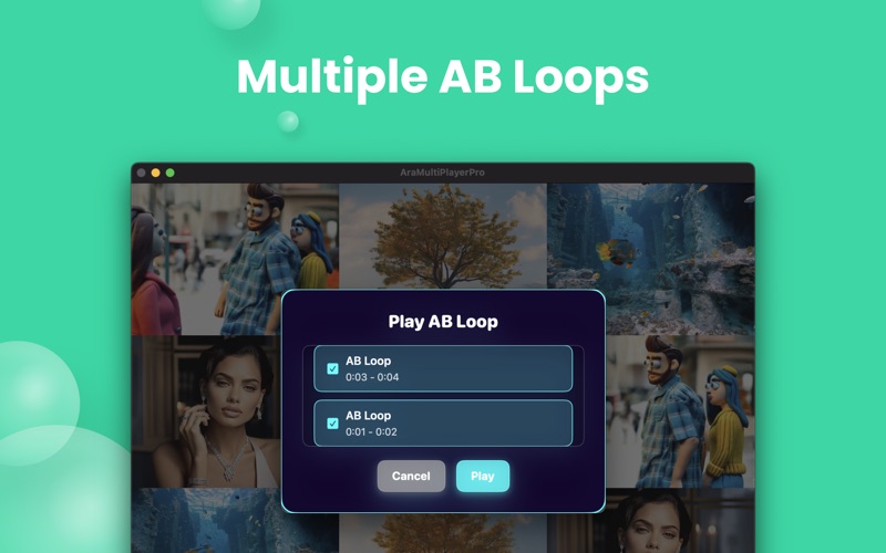 A video player that allows infinite playback of multiple videos simultaneously. Key Features: * Infinite Loop: Videos will restart from the beginning once they finish. * Auto Mute : Videos start in mute by default. * Multi-Screen Playback: Enjoy different videos simultaneously on 1 to 4 screens (up to 9 screens for tablets). * AB Repeat: Set your favorite segment as AB for infinite loop playback. Focus on learning, practicing, or enjoying your favorite scenes. * Random Play & Playlist: Enjoy random play for a varied experience and organize videos with the playlist feature for systematic management. ----------------- This app provides powerful AB Repeat functionality, allowing you to set and infinitely loop your favorite video segments. You can designate specific parts of a video as AB for repeated playback, ideal for focused learning, practice, or revisiting enjoyable scenes. This feature is particularly useful for repeatedly viewing key moments or favorite segments.