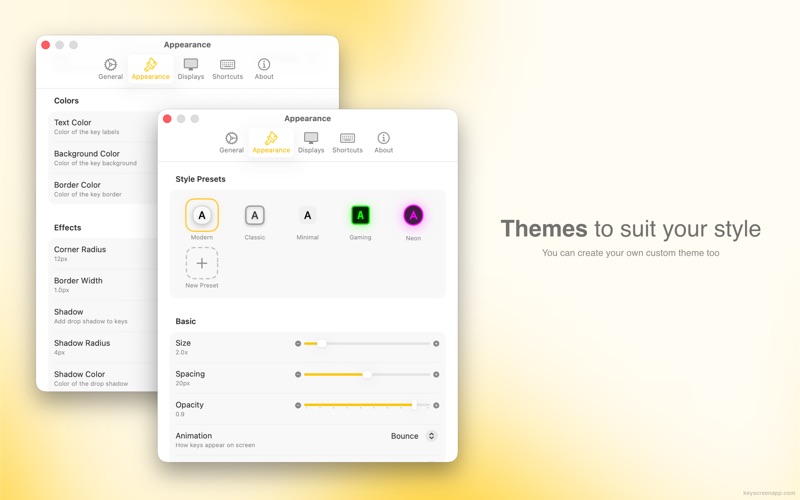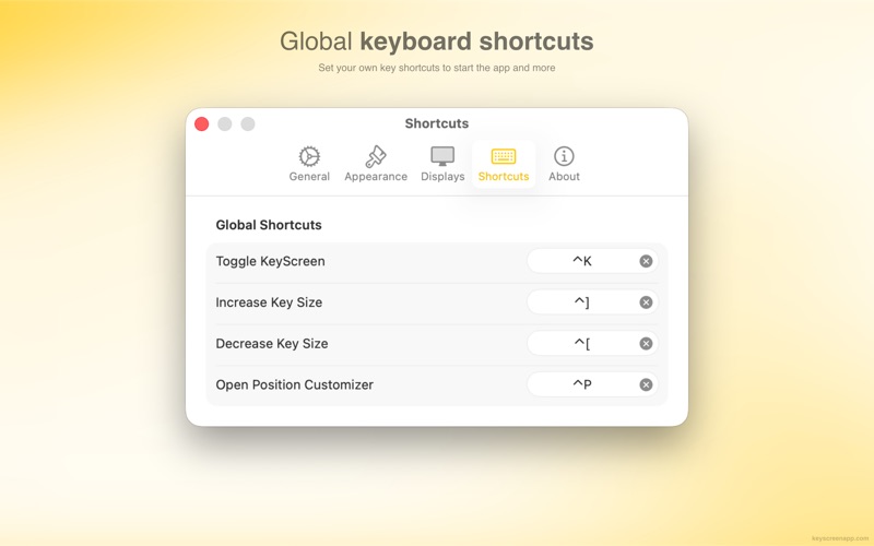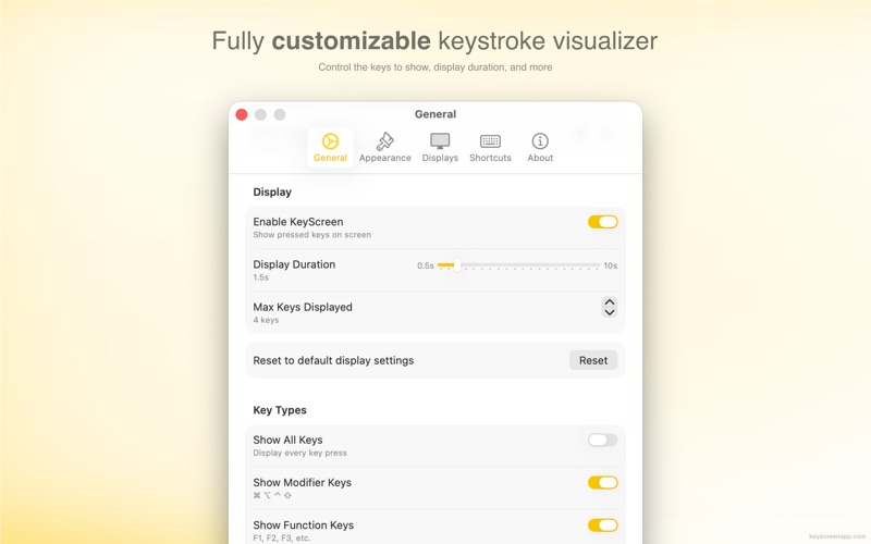 KeyScreen makes your keystrokes visible on screen—perfect for tutorials, presentations, and screen recordings. Whether you’re creating tutorials, demonstrating software, or presenting live, KeyScreen ensures viewers never miss a keystroke. Keystrokes appear beautifully on screen in real time, making your content easier to follow and more professional. Prefer not to show every key press? Choose any combination of modifiers (⌘, ⌥, ⌃, ⇧), function keys (F1–F12), and special keys (Enter, Esc, Tab, Delete). FEATURES • Fully Customizable: Choose fonts, colors, sizes, positions, animations, and more to match your brand or preferences. • Smart Key Combinations: Display all keys—or any combination of modifiers (⌘, ⌥, ⌃, ⇧), function keys (F1–F12), and special keys (Enter, Esc, Tab, Delete). • Multiple Display Support: Position the overlay wherever works best, on any screen. You can choose one of the preset positions or drag it anywhere on the screen. • Themes: Use one of five default themes, or create your own. • Keyboard Layouts: Works with all keyboard layouts like QWERTY, AZERTY, QWERTZ, Arabic, and more. • Lightweight and Fast: As a native app, it uses minimal system resources, so there’s no lag during recordings. • Recording-Ready: Works seamlessly with screen-recording software and streaming tools. • Privacy-Focused: Doesn’t show passwords and works entirely on-device. PERFECT FOR • Tutorial creators and educators • Software demonstrations and product demos • Live presentations and webinars • Streaming and content creation • Accessibility and teaching environments Stop losing viewers to unclear keyboard shortcuts. Make every key combos visible with KeyScreen. CONTACT • Website: https://keyscreenapp.com • Social: https://x.com/softal_io or https://x.com/rampatra_