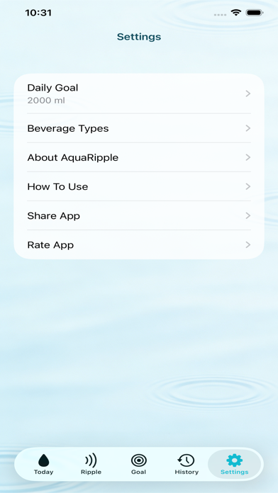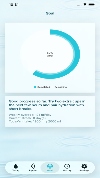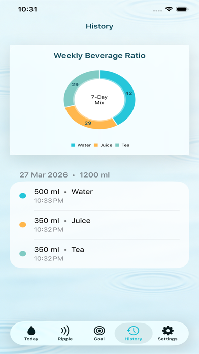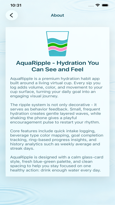 AquaRipple is a premium hydration habit app built around a living virtual cup. Every sip you log adds volume, color, and movement to your cup surface, turning your daily goal into an engaging visual journey. The ripple system is not only decorative - it serves as behavior feedback. Small, frequent hydration creates gentle layered waves, while shaking the phone gives a playful encouragement pulse to restart your rhythm. Core features include quick intake logging, beverage type color mapping, goal completion tracking, ring-based progress insights, and history analytics such as weekly average and streak days. AquaRipple is designed with a calm glass-card style, fresh blue-green palette, and clean spacing to help you stay focused on one healthy action: drink enough water every day.