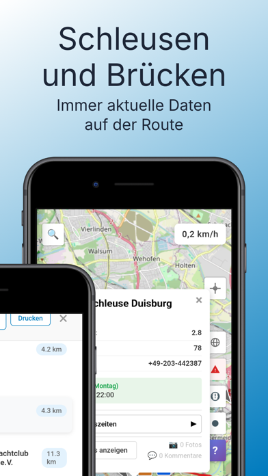 Entdecken Sie online Navigation auf dem Wasser, genau so einfach wie mit Ihrer Auto Navi App. Geben Sie Ihre Bootsdaten ein für eine sichere Fahrt mit genug Tiefgang und Durchfahrtshöhe. Distanz, Ankunftszeit, ELWIS-Meldungen zu Störungen, Anzahl Brücken, Schleusen, Häfen uvm. und natürlich viele weitere Funktionen: Routenspeicher – GPS Kartenplotter – Drehbare 2D und 3D Karte - Satelliten-Ansicht - Regenradar - eigene POI's - Fotos für Häfen, Schleusen, POI's - AIS - Für iPhone, iPad, PC – und iPad.