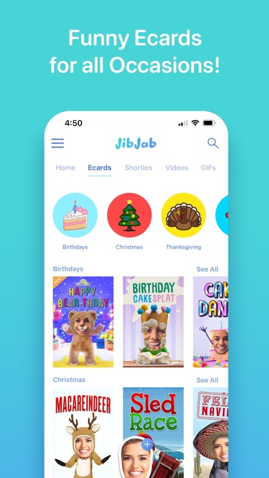 Make every moment special with JibJab! Create personalized greeting cards, videos, GIFs, and AI Photo Packs that bring laughs and smiles to any occasion. Our legendary Ecards are always a hit, and now you can wow your friends and family by creating the funniest AI images with Starring You® AI Image Packs. With just one photo, you can swap yourself or others into fun and unique pictures to share for a laugh. Having fun with AI has never been easier! Celebrating 23 years of being the #1 app for ecards and funny personalized videos! Come and see why over 84 MILLION people use JibJab to make awesome funny videos, GIFs, Ecards, greetings and OUR BRAND NEW STARRING YOU® AI Art! A FUN ECARD TO SHARE FOR ANY HOLIDAY * Mother’s Day * Father’s Day * Halloween * Thanksgiving * Christmas * Valentine’s Day * St. Patrick's Day * Easter and more! SPECIAL OCASSION? WE HAVE IT ALL! * New Years * Graduations * Anniversaries * Apologies or just to cheer up your loved ones – we've got Ecards, GIFs and videos for that! JOIN THE MILLIONS CREATING WITH JIBJAB * The LARGEST collection of funny videos, Ecards and GIFs to personalize * Now introducing CUTTING EDGE AI art generation to put you or your loved ones into hilarious scenes! * FRESH content and updates all the time * Family Fun - Upload pictures of the whole family to make funny group videos * One-Tap Sharing - Post to social media or save to your camera roll HOW IT WORKS: 1. Snap a Selfie - Of you, family members, or even your pet. 2. Stick your face in it - Select the perfect Ecard, GIF, video or roll the dice with one of our ridiculously fun Starring You® AI photo packs! 3. Get the LOLs - Share with family and friends in seconds! SUBSCRIPTION: Enjoy premium Ecards and music videos with a JibJab membership. Share any or all of our 1,500+ exclusive Ecards, GIFs, videos and Starring You® AI photo packs via our app and website. Payment will be charged to your iTunes Account at confirmation of purchase. Memberships automatically renew for $6.99 each month or $35.99 per year unless auto-renew is turned off at least 24-hours before the end of the current period. You may manage your auto-renewal by visiting your iTunes Account Settings after purchase. Free GIFs are always there for you to view and share. For the complete terms, see: JibJab’s Terms of Sale: https://www.jibjab.com/terms-of-sale Questions for us? We love hearing from you! Reach out at help@jibjab.com. Download JibJab today and make your loved ones laugh!