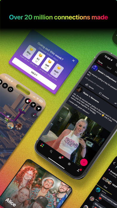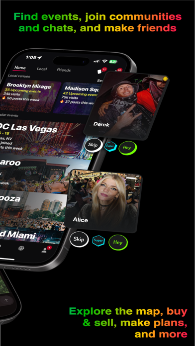 Radiate is the leading way to connect with people going to the same concerts, festivals, and nightlife events as you. Discover events, see who's going, and make new connections. - Dedicated group chats and forums for each event, allowing you to easily connect with others attending - Secure PayPal-backed ticket and clothing marketplace for safely buying or selling tickets and more, all in one place - A 3D social map of events, friends' plans, and more BUY & SELL TICKETS & MORE FROM OTHER ATTENDEES ON THE RADIATE MARKETPLACE - PayPal Buyer and Seller Protection on eligible transactions - Escrow-style flow where sellers get paid only after sending confirmation - No flaky meetups or cash exchanges - Ideal for festival passes, concerts, club nights, and more EXPLORE THE WORLD THROUGH THE RADIATE MAP Our interactive 3D map shows you who's going to what - from massive festivals like EDC Las Vegas and Coachella to underground shows and spontaneous afterparties. See the pulse of events in real time and find where the energy is flowing tonight. CONNECT WITH PEOPLE HEADING TO THE SAME EVENTS This is where festival crews, rave fams, concert buddies, and nightlife communities actually come together. - See others attending your events - Join event chats and meet new friends - Plan, pre-game, link up - Share the moments that make live events magic AND YES, THERE'S A MULTI-COLORED RHINO Whether you're looking for a festival squad, a concert buddy, a travel partner, or someone to share a late-night adventure with, Radiate helps you meet the people you're meant to meet. Experience the world where music, connection, and unforgettable nights collide. Download Radiate now. "One of the primary reasons people go to festivals is for the community, and that's what Radiate provides." - Insomniac —------- Radiate is free to download and use forever. You can optionally upgrade to Radiate Glow for additional features. We offer 1-month, 3-month, and 6-month plans. Prices vary by country. - Payment is charged to your iTunes account at purchase - Auto-renews unless turned off at least 24 hours before the end of the period - Manage your subscription anytime in Account Settings - Free trial (if offered) forfeits when Glow is purchased If you choose not to subscribe, you can continue enjoying Radiate for free. Privacy Policy: https://www.radiatetheworld.com/privacy/ Terms of Use: https://www.radiatetheworld.com/terms_of_use/