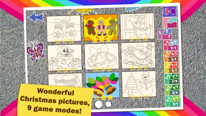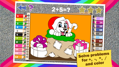 Colorful Math — amazing fascinating coloring which is suitable for kids from 2 years and for younger school-kids. The game combines favorite children's coloring books and interesting math problems. With Colorful Math your child will be so involved in the game that he will spend time with benefit and will give parents some time to relax! FEATURES: - Cute Christmas pictures - 9 game modes - Mix paints to get new colors - Simple coloring - Coloring by pattern - Coloring by numbers - Math coloring: problems for +, -, * и / - Simple kids-friendly interface - Colorful graphics - Pleasant sounds and music - Approved by kids and parents In the game 9 modes are available, which will be interesting for kids of different ages — from 2 to 10 years! Mode «SIMPLE COLORING» is good to develop children's motor skills and is suitable for kids who just learn the colors. Mode «COLORING BY PATTERN» develops logic skills and will be useful for older kids, who will be able to mix paints to get new colors. Mode «COLORING BY NUMBERS» will introduce children to the world of numbers and 6 modes «COUNT AND COLOR» will be excellent helpers for younger school-kids who learn to add, subtract, multiply and divide. BONUS SYSTEM motivates young players to learn diligently: the child makes fewer mistakes and gets more stars! Simple KIDS-FRIENDLY INTERFACE makes the game enjoyable and comfortable for kids, helps them to learn colors, numbers, addition, subtraction and multiplication table easily and quickly. With Colorful Math kids will love math and will spend time with pleasure and benefit, and their parents finally will be able to do their own work! * Free version of the app contains 4 pictures and 9 game modes. Paid version contains 18 pictures.